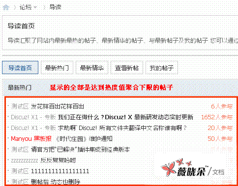 举例:这里设置的值填写为 30,当帖子的热度值达到 30 的时候,便会显示在导航中导读的最新热门下,如下图所示: