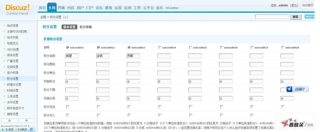管理中心 => 全局 => 积分设置 在基本设置中,系统提供给了扩展积分设置、总积分计算公式以及交易积分设置: