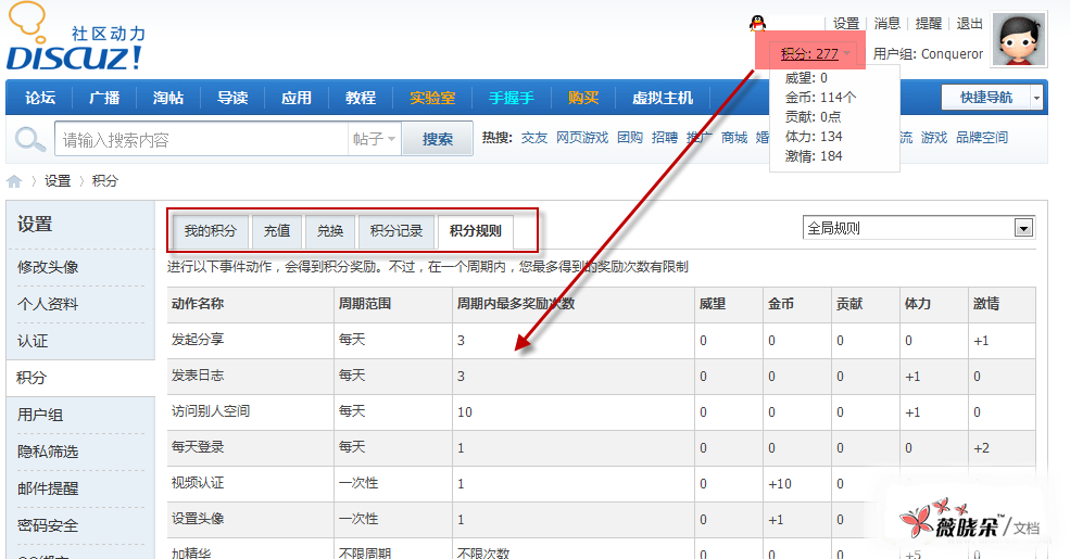 积分系统构成了社区的价值体系,在站点中的两大作用就是衡量用户级别和参与站内交易。会员可以赚取金钱、获得威望、做出贡献,还可以参与主题和商品的购买,这些操作都需要通过积分来体现。另外,公平、合理的积分系统也能增加用户的荣誉感和积极性,站长灵活的运营和调整积分策略能够很好的辅助社区运营。