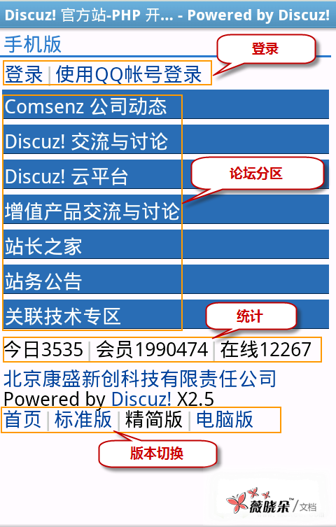 当论坛开启了手机版时,用手机访问论坛将自动跳转到手机版界面,手机版分为标准版和精简版。标准版为全功能手机版式;精简版为去掉小图标、主题列表日期等页面元素的精简版式;两种模式下表情均解析,用户可以根据自己需要切换在标准版、精简版和电脑版之间自由切换。