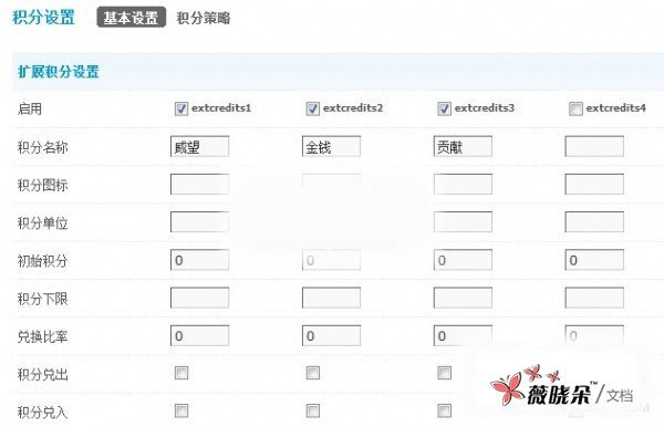 其中 posts 代表发帖数 (主题 + 回复数);threads 代表用户发表的主题数;digestposts 代表精华帖数;oltime 代表用户总在线时间 (小时);friends 代表好友数;doings 代表发表的记录数;blogs 代表发表的日志数;albums 代表上传的相册数;polls 代表发表的投票数;sharings 代表发表的分享数;extcredits1~extcredits8 分别代表上述 8 个自定义积分。