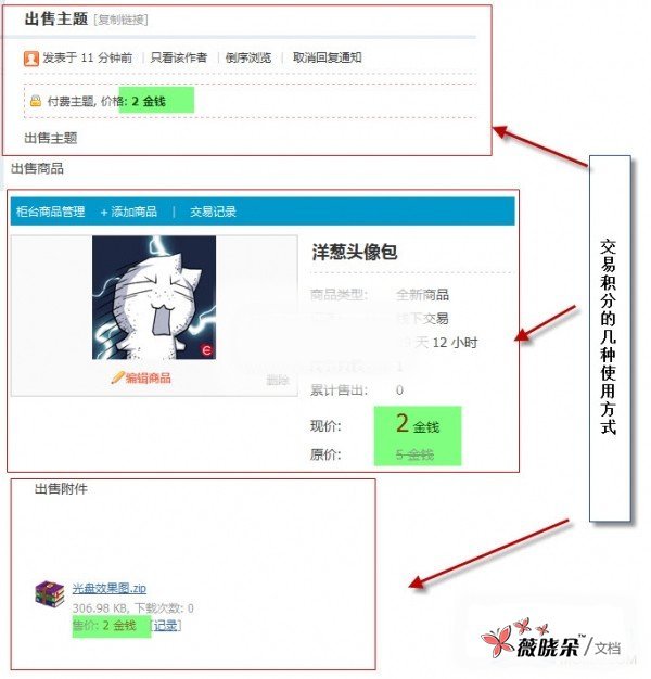 当扩展积分项被设置为交易积分后,用户就可以用这些积分来进行站点的虚拟物品或实体物品的交易,形成一套虚拟的货币流通机制。虚拟物品交易包括主题、附件的购买,悬赏、评分的给予,以及商品的交易等。