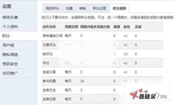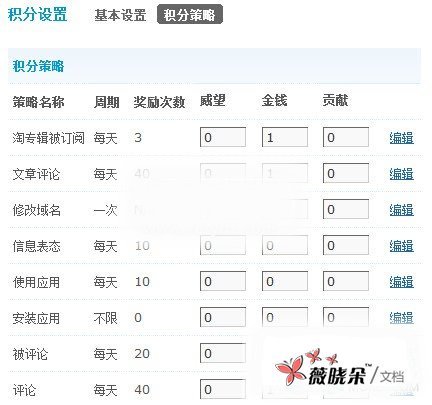 每一项积分的增减规则可以由站点在 「积分策略」 中予以设定。由于 X1.5 的系统是结合了论坛、群组、家园等的一个统一的站点系统,所以会员在站点中的活动,无论是在论坛里发帖、回复,在群组里讨论,或是在家园里发表日志、图片、分享等,都可以在这里设置全站统一的积分策略。
