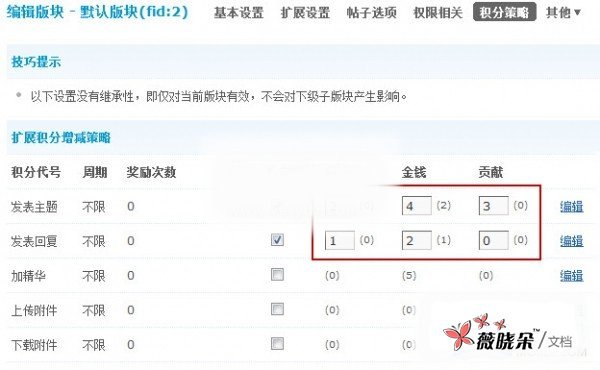 特别要注意的是,如果在某个版块中单独设置了积分策略,那么版块中的增减策略优先级要高于全站积分策略。如下图中,版块的积分策略中,输入框中为本版的积分策略,旁边的括号中是全站积分策略中此项的设置,当两项数值不一致时,以版块设置为优先。
