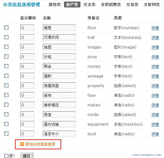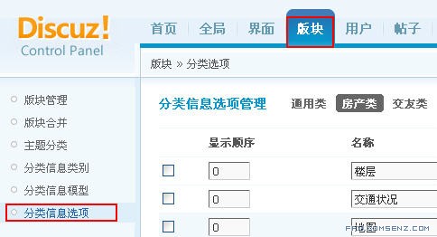 后台 => 版块 => 分类信息选项,下图所示: