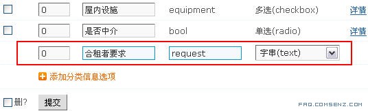 比如发布出租信息时,可能需要说明对合租者的要求,那么我可以再这里添加 「合租者要求」 这个选项,点击 「添加分类信息选项」: