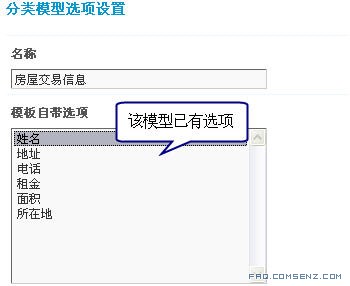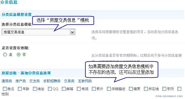 分类信息模型即信息类别的模型。设置模型时,需要第一步分类信息选项中的各个选项。同时分类信息模型设置好后,以后添加分类信息类别时就可以直接套用该模型。