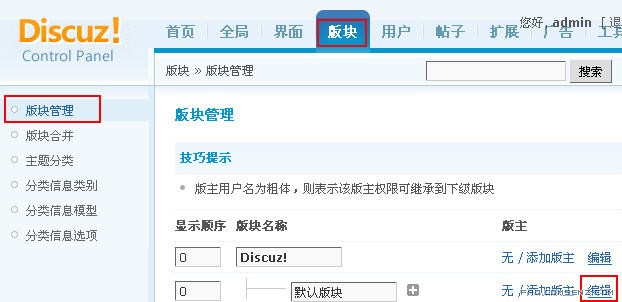 后台 => 版块 => 版块管理,找到要开启信息分类的版块,点击后面的 「编辑」 按钮: