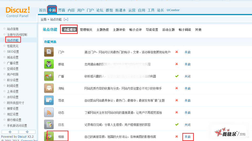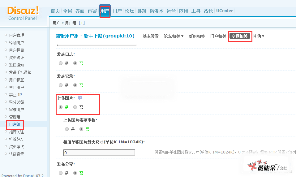 Discuz 教程:开启上传相册图片功能 论坛的后台--全局--站点功能--功能模块--相册开启 后台--用户--用户组--编辑--空间相关--上传图片选择: 是 上传图片需要审核: 否 相册单张图片最大尺寸 (单位 K 1M=1024K): 设置 在发帖的页面就会出现相册发帖了。 小雨2016-11-09T00:15:31+08:00发表于:2012-01-06|Discuz!|