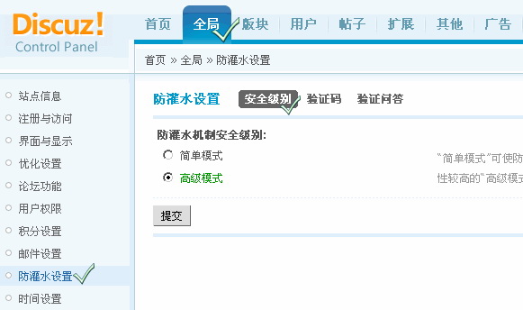 防灌水机制安全级别:「简单模式」 和 「高级模式」