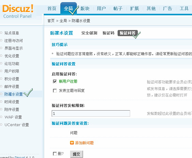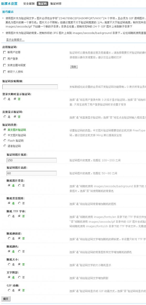 灌水机已经成了目前很让站长头疼的事情,为此,Discuz! 6.1.0 设计了强大的防灌水机制,两种安全级别加上验证码和验证问答,使得绝大多数的灌水机望而却步。下面详细讲解下其使用方法,进入系统后台 => 全局 => 防灌水设置。