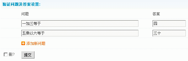 站长可以在 「新用户注册」 或者 「发表主题与回复」 的时候启用验证问答。