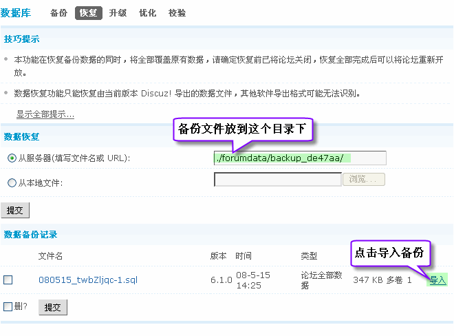 1 、将论坛备份的 .sql 数据文件放到论坛后台 => 工具 => 数据库 => 恢复:选择 「从服务器 (填写文件名或 URL)」 默认的 forumdataackup_ 类型的目录。