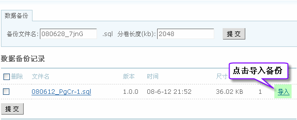 2 、 UCenter 后台 => 数据备份 => 可以看到备份的文件,点击 「导入」 即可导入备份。