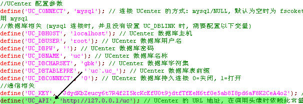 注意:'UC_API' 是指 UCenter 的 URL 地址, 在调用头像时依赖此常量,这里一定要填写正确否则头像无法显示