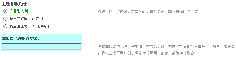 2 、论坛后台 => 版块 => 编辑中 => 帖子选项 => 本版块允许附件类型;
