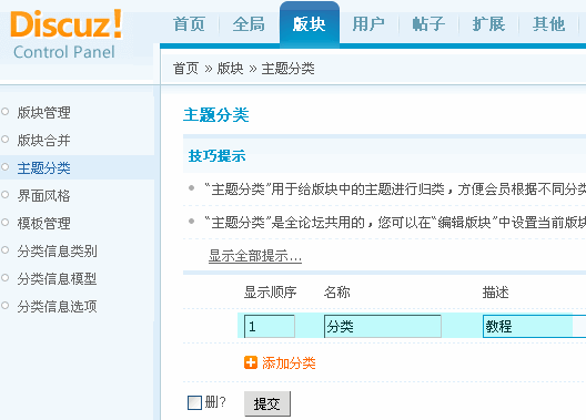1 、后台 => 版块 => 主题分类 => 添加分类填写好分类的名称,提交。如果需要同时添加多个,可以点击 「添加分类」 。