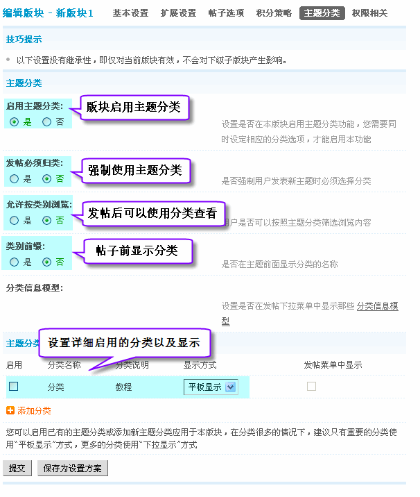 2 、后台 => 版块 => 编辑 => 主题分类 => 启用主题分类,选择 「是」,可以看到下图: