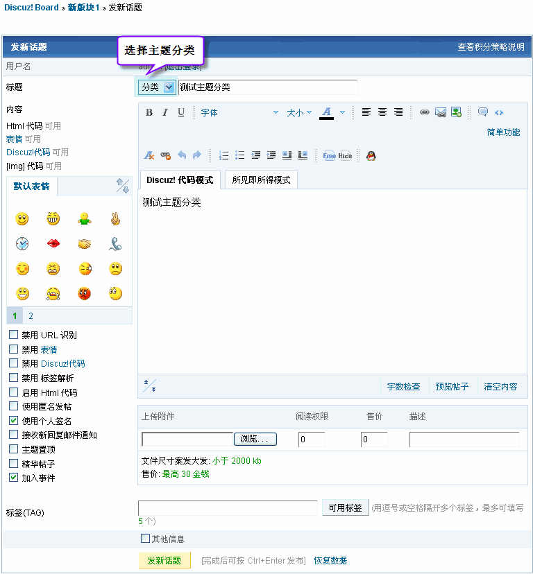 二、主题分类的使用和显示发表新的主题,选择分类;