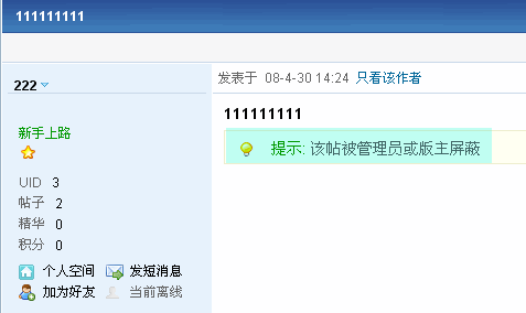 3 、点击上图中的 「屏蔽帖子」 按钮,则该帖子内容被屏蔽: