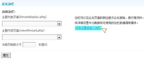边栏,在这个版本中,我们首先会从 「界面和显示方式」 中看到他的影子,不管您是全新安装还是升级到 Discuz! 6.1.0 都会预置 2 个边栏项目 「边栏 1」 和 「边栏 2」,我们可以选择它们在 「主题列表页面 (forumdisplay.php) 」 和 「主题内容页面 (viewthread.php)」 显示。当然,这对您来说肯定是不满足的。点击下图中所指的自定义边栏链接,便可自定义数据调用功能。