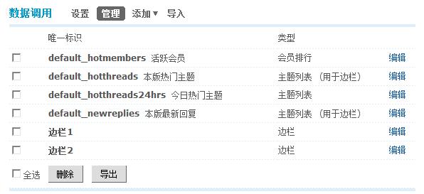 如上图,我们用自定义类型把本版热门主题和本版最新回复聚合成了一个调用。通过如此方法,我们可以用自定义类型设计一个首页 n 格。然后把设计好的内容导出分享给其他人,其他人只要导入到后台,在 discuz.htm 中添加上内部调用代码即可显示出来了。