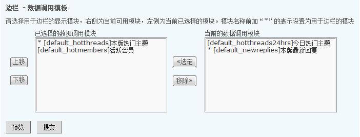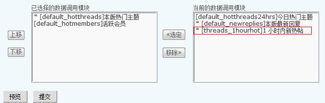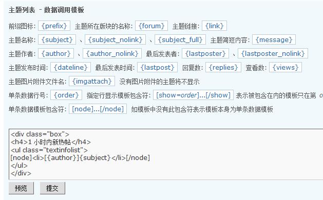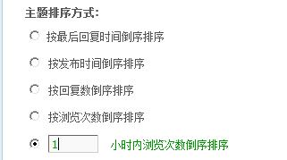 模板中各个标记的含义可参考它的解释。而后,如果您只想显示当前版块的帖子,可以在下面的 「只显示当版块内容 (边栏):」 选择 「是」 。如果您选择否,那么这个调用项目将显示您论坛所有版块的新帖子。最后,我们选择按照 1 小时内浏览次数倒序排序