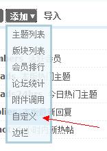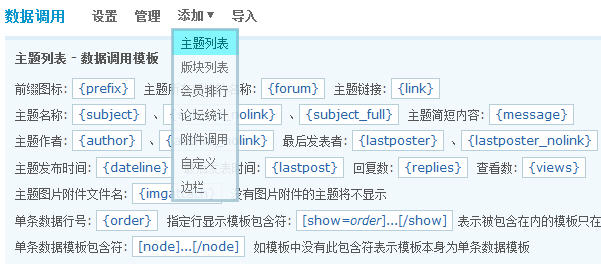 下面就为您详细介绍。在添加自己的调用项目前,您先想好要调用哪些方面的内容,是主题、版块、会员、统计、还是附件。比如我们要调用 1 小时内的新热帖。我们先点击上面的 「添加」 按钮,选择 「主题列表」