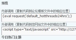 如果您要在论坛的其他地方调用这个 「今日热门主题」 需要用到外部调用,把外部调用的代码写到您需要调用的网站文件的相应位置即可。如果您只需要在论坛内部的某位置显示,则可以用到内部调用,把内部调用的代码写到您论坛模板文件的相应位置即可,如 discuz.htm 首页模板文件。