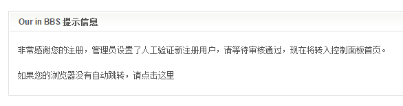 这样在新用户注册成功之后就会提示:「管理员设置了人工验证新注册用户,请返回等待审核通过。」