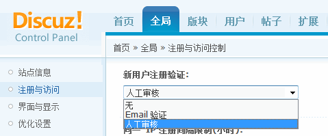 如果您的网站希望在新用户注册的时候,由人工审核通过,可以在论坛的后台 => 全局 => 注册与访问 => 注册 => 新用户注册验证,在这里选择 「人工审核」,然后提交即可。