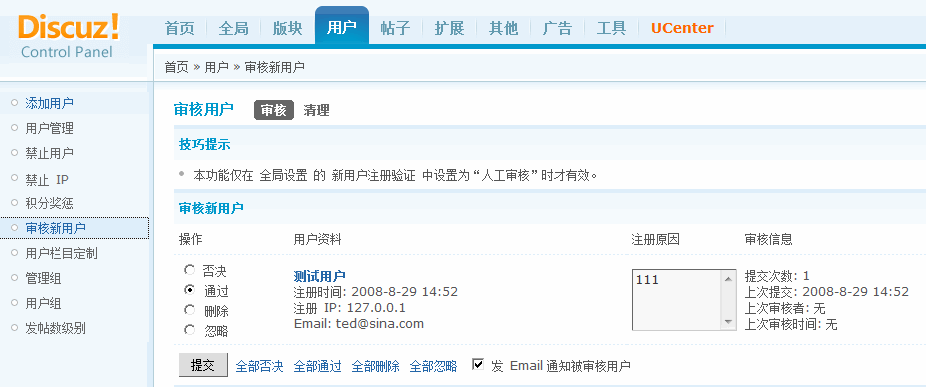 这样管理员就可以在论坛后台 => 用户 => 审核新用户 => 审核中看到新注册的用户了,可以通过选择 「否决」 、 「通过」 、 「删除」 、 「忽略」 四种操作中的一种来审核新用户。