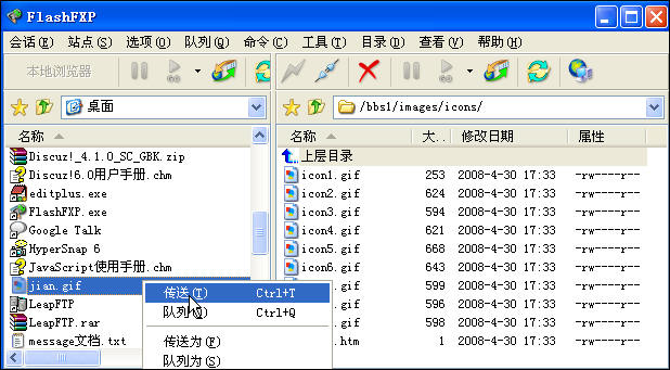 比如需要添加一个 jian.gif 主题图标,则通过 FTP 上传该图片到论坛根目录下的 /images/icons 目录,如下图所示: