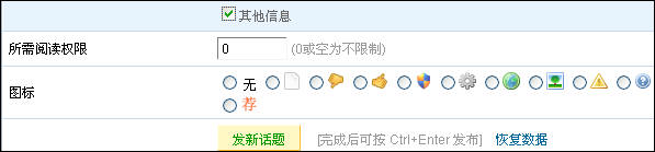 登录论坛前台,发表一新主题时,点击编辑器下的其他信息选择框,即可看到主题图标的添加,下图所示: