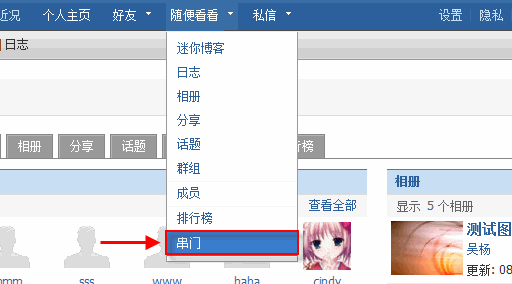 在 UCenter Home 1.5 RC2 的 「随便看看」 功能中增加了 「串门」 一项,如下图所示:
