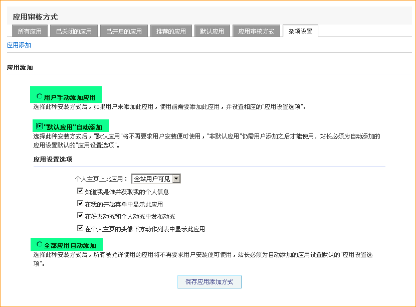 注意:如果选择自动添加,站长必须为自动添加的应用设置默认的"应用设置选项"。