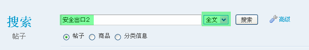 2 、在打开的搜索页面中,「作者」 一项填写要搜索的用户的用户名,比如安全出口 2,然后搜索方式选择 「全文」,设置如下图: