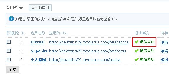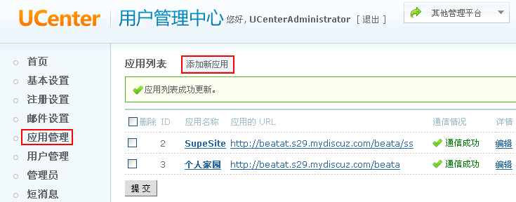 到此,您已经成功恢复了误删的应用,UCenter 后台 => 应用管理,可以看到通信成功: