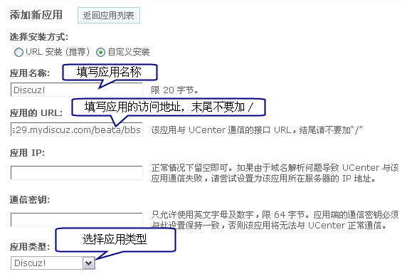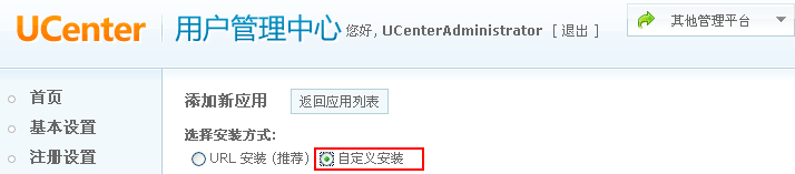 UCenter 后台 => 应用管理 => 添加新应用 => 自定义安装,如图: