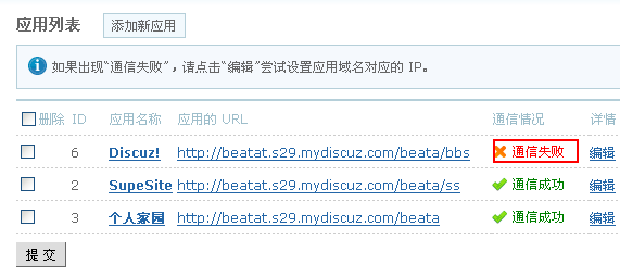 UCenter 后台 => 应用管理,可以看到通信失败: