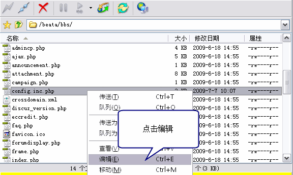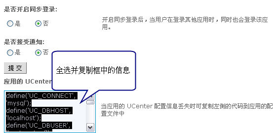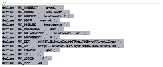 用刚才在 UCenter 后台复制的内容覆盖上图中选中的内容,保存文件,重新上传修改后的 config.inc.php :