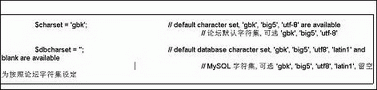 在配置 config.inc.php 文件时需重视的一点就是关于字符集的设定问题。 charset 为论坛默认的字符集,您下载了哪个版本的论坛相对应的字符集就是哪个,比如你下载的 Discuz!5.0.0_SC_UTF8 ,那么你的论坛字符集 (即 charset) 就是 UTF8 ;而 dbcharset 为论坛数据库的字符集 (即 MySQL 的字符集),也就是在服务器安装的 MySQL 的字符集,如果您的服务器上安装的 MySQL 的字符集为 latin1,那么在配置 config.inc.php 时您就得将 dbcharset 填写为 latin1 。到此,相信很多朋友已经明白自己的论坛为什么会出现乱码的问题了,原因就是没有设置正确的字符集,只要按照上面的讲解设置相信您的论坛将不会再有乱码问题。如下图所示: