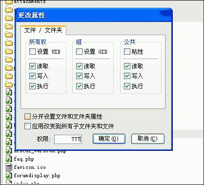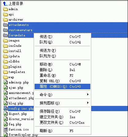 1 、上传 Discuz! 5.0.0(除 install.php 文件外) 的所有程序文件到服务器覆盖原 Discuz! 4.1.0 程序, 并修改 attachments 、 customavatars 、 forumdata 、./forumdata/cache 、./forumdata/templates 、./forumdata/threadcaches 、 templates 的目录属性为 777 。如下图所示: