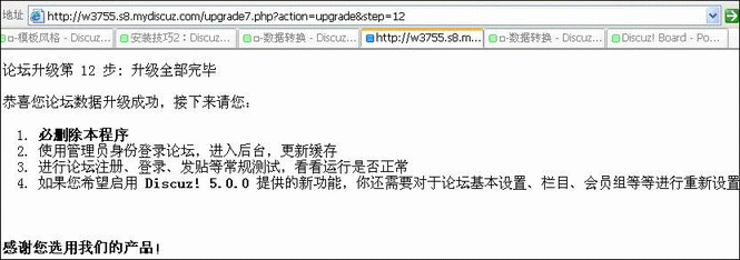 至此,Discuz! 4.1.0 - Discuz! 5.0.0 升级成功!现在您可以在后台开启您的论坛让它运行了!