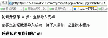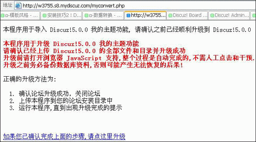 3 、 Discuz! 5.0.0 新增 「我的」 功能,主要记录用户在论坛上发表的主题和回复。论坛升级完毕,用户无法查看自己以前发表的相关内容。如您的论坛确实需要将会员以前发表的内容导入到新功能之中,可以使用 ./utilities/myconvert.php,上传到服务器后运行,按照提示操作即可。由于此过程需要耗费较大服务器资源,建议只有十分必要的时候才使用。