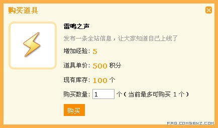 在此可以看到购买该道具可以增加的经验值、道具的单价、现有的库存,然后填写您要购买的数量。注意:当前最多可购买数量是根据库存和您现在拥有的积分来算的,您购买的数量不能超过当前库存,同时在库存足够的情况下,您的积分值要大于您购买道具需要的积分。