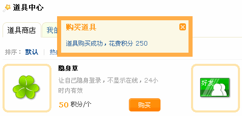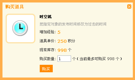 在此可以看到购买该道具可以增加的经验值、道具的单价、现有的库存,然后填写您要购买的数量。注意:当前最多可购买数量是根据库存和您现在拥有的积分来算的,您购买的数量不能超过当前库存,同时在库存足够的情况下,您的积分值要大于您购买道具需要的积分。