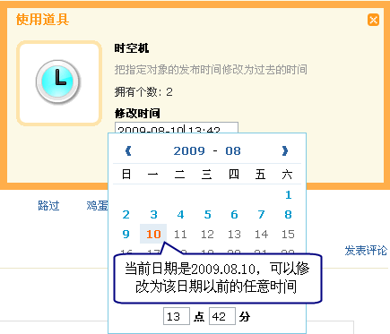 道具 「时空机」 的功能:指定自己发布的某个对象,将其发布时间修改为过去的任意时间。