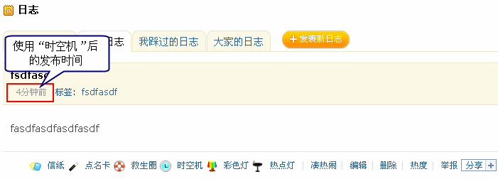 下面我们来说明下如何使用 「时空机」 道具,以修改一篇日志的日期为例: