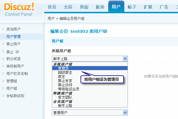 搜索到用户后,对该用户所在的用户组编辑为管理员组。
